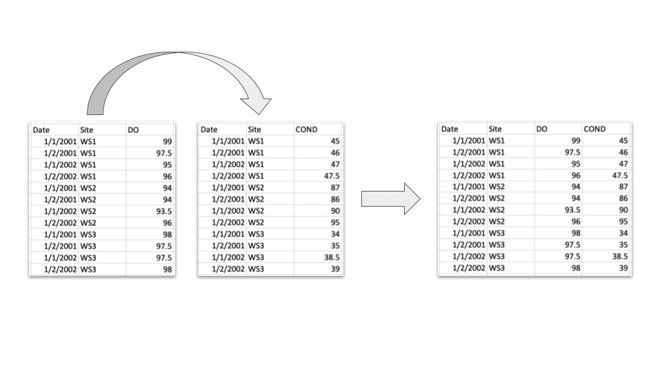 - Mediciones de distintas condiciones en un mismo sitio y día pueden unirse a generando columnas nuevas de cada condición